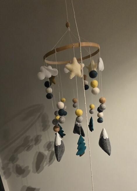Ręcznie robiona karuzela składająca się z elementów uszytych z filcu oraz kulek filcowych. Ciekawa dekoracja do każdego ...